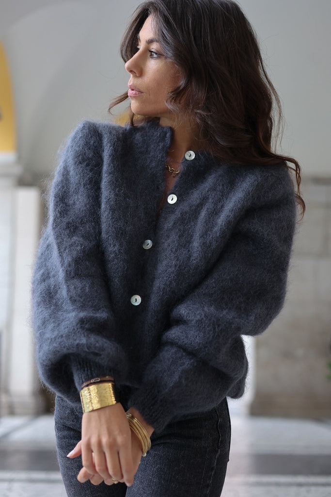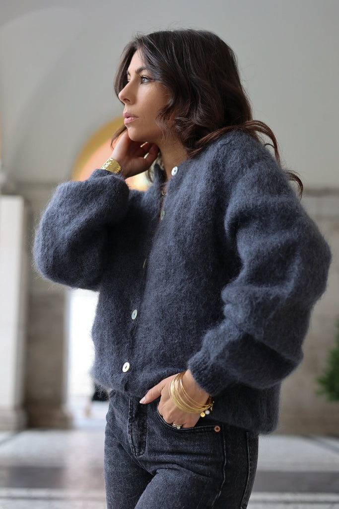 • Gilet gris foncé, col rond en fluffy mohair de qualité premium